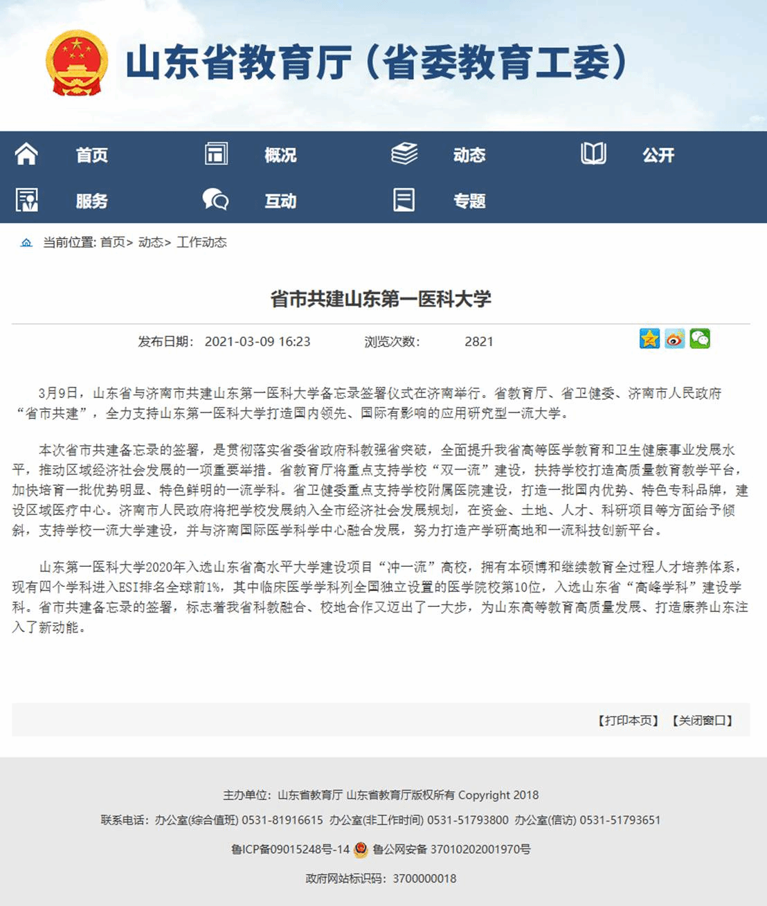 项目简介:省教育厅、省卫健委、济南市人民政府 “省市共建”,全力支持山东第一医科大学打造国内领先、国际有影响的应用研究型一流大学。