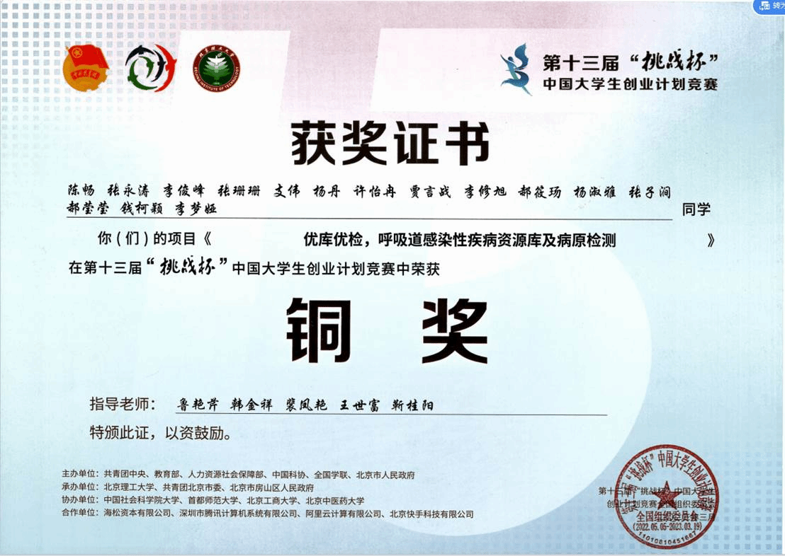 第十三届“挑战杯”中国大学生创业计划竞赛(2023)铜奖,第十三届“挑战杯”中国大学生创业计划竞赛全国组织委员会,2023.03