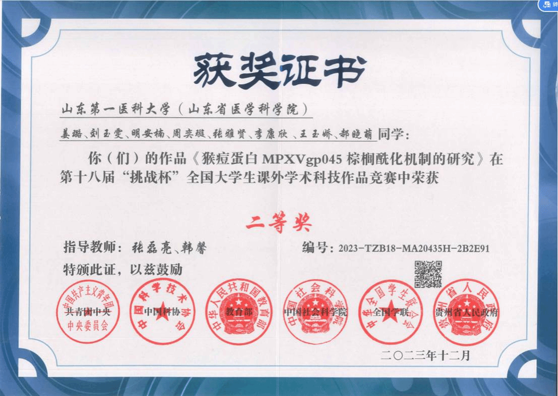 1. 第十八届“挑战杯”全国大学生课外学术科技作品竞赛(2023)银奖,共青团中央、中国科协、教育部、中国社会科学院、全国学联/贵州省人民政府,2023.12