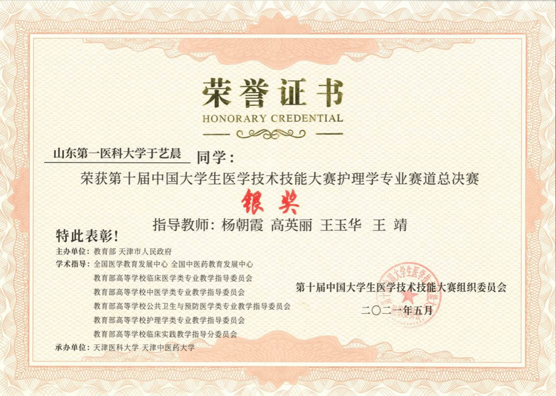 第十届中国大学生医学技术技能大赛全国总决赛(2021)银奖,教育部,2021.05