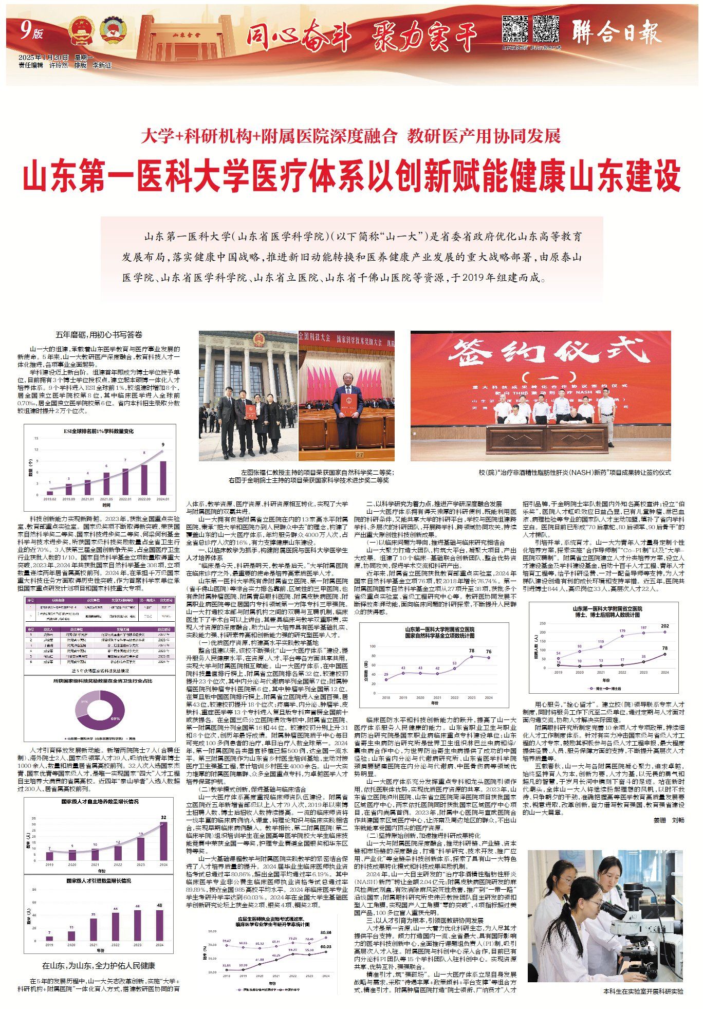 1月20日,《联合日报》以“大学+科研机构+附属医院深度融合 教研医产用协同发展 山东第一医科大学医疗体系以创新赋能健康山东建设”为题,概述了校(院)科教融合五年来在教育、科技、人才方面的突出成绩;详细阐述了校(院)实施“大学+科研机构+附属医院”一体化育人方式,搭建教研医协同育人体系,教学资源、医疗资源、科研资源相互转化,实现大学与附属医院双赢共进的实践探索。全文转载如下: