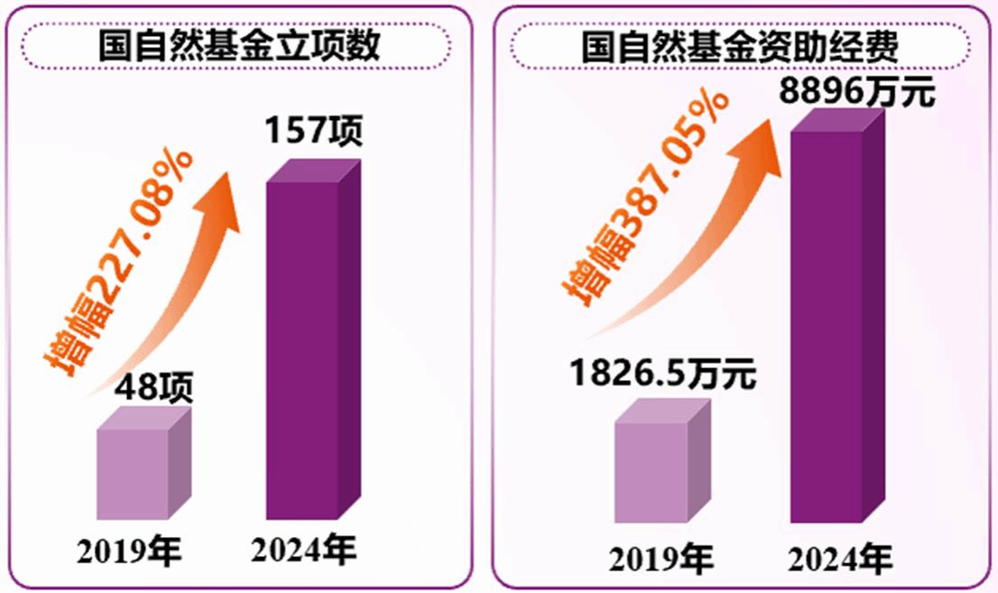 1.承担国家重大科研项目的能力持续增强,其中国家自然科学基金的表现尤为突出。2019年-2024年,国家自然科学基金立项数和经费额均大幅增长,呈现国家级高层次项目量与质双升态势。